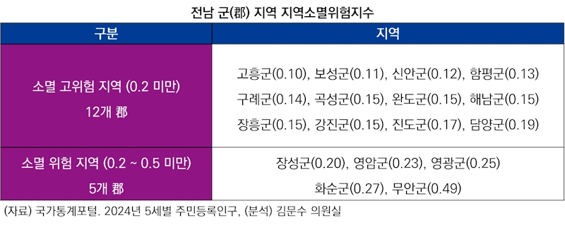더불어민주당 김문수 국회의원(전남 순천갑)이 2024년 기준 지방소멸위험지수를 분석한 결과, 전남 여수·순천·나주·광양 등 도농복합도시에 속한 34개 면 지역 중 85%에 해당하는 29곳이 소멸 고위험 지역(0.2 미만)로 분류됐다. 여기에 소멸 위험 진입 단계(0.2~0.5 미만)까지 포함할 경우, 전체 면 지역의 95%가 지방소멸 위험권에 속한 것으로 나타났다.