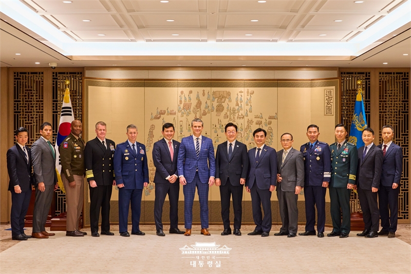 이재명 대통령은 11월 4일(화) 오후 대통령실에서 한미안보협의회의(SCM : Security Consultative Meeting) 참석을 위해 한국을 방문한 피트 헤그세스 미국 전쟁부장관의 예방을 받고 한미동맹이 미래형 포괄적 전략동맹으로 심화 발전해 나가는 데 있어 헤그세스 장관의 중요한 역할을 당부했습니다. 이 대