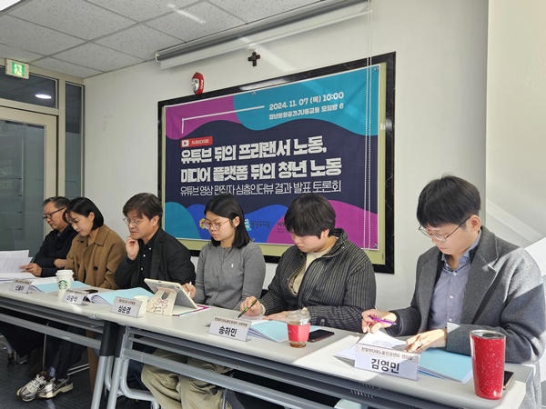 7일 오전 서울 마포구 청년문화공간JU동교동에서 진행된 ‘유튜브 뒤의 프리랜서 노동, 미디어 플랫폼 뒤의 청년 노동’(한빛미디어노동인권센터·청년유니온·사무금융우분투재단 주최) 토론회에서 변화하는 미디어 산업 구조 속 새롭게 탄생한 ‘유튜브 영상 편집자’의 노동 실태 관련 논의가 이뤄졌다.