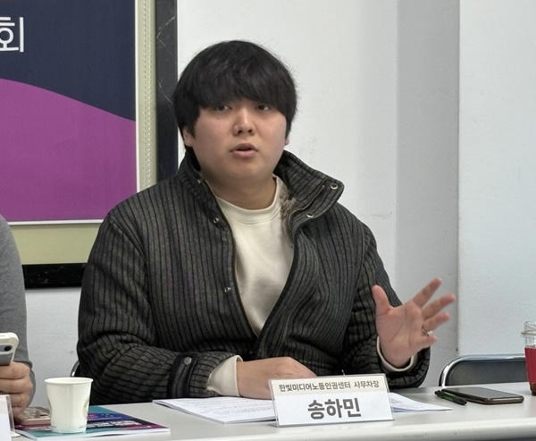 ▲ 7일 토론회에서 발언하는 송하민 한빛미디어노동인권센터 사무차장. 사진=윤유경 기자.