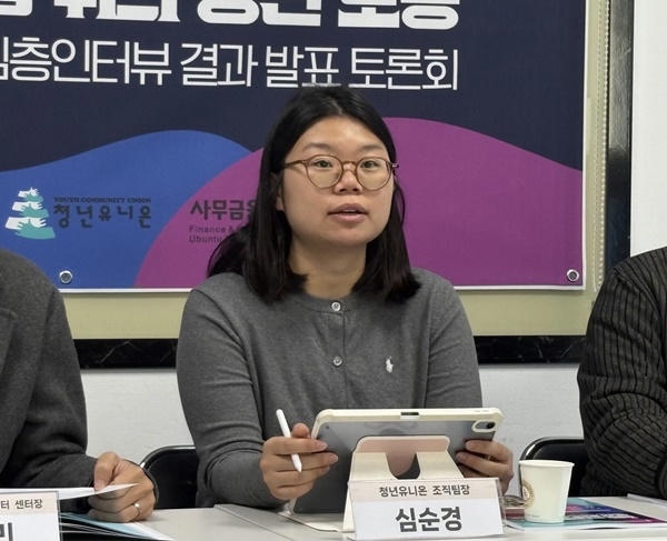 ▲ 7일 토론회에서 발언하는 심순경 청년유니온 조직팀장. 사진=윤유경 기자.