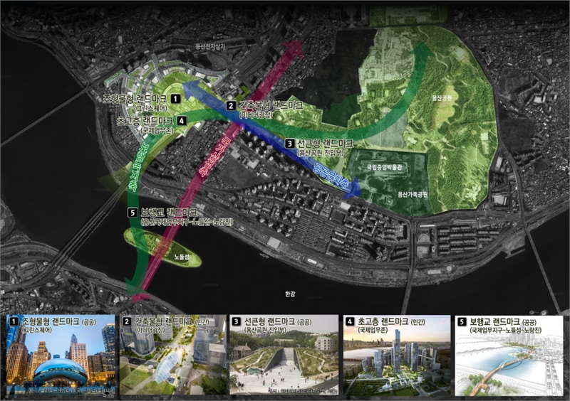 (상징적 공간) 용산시대 구현에 발맞춰 정치(대통령실), 경제(용산국제업무지구), 문화(용산공원) 기능을 연결하고 시너지를 강화할 수 있는 랜드마크를 조성해 국민들의 자긍심을 고취하고 공간 상징성도 강화합니다.