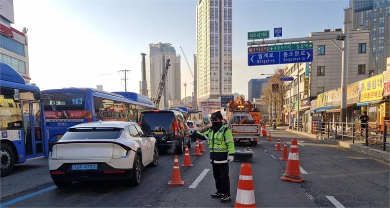 현장에는 교통 혼잡과 안전을 위해 경찰과 교통정리원이 안내하고 있으며, 염화칼슘을 살포해 도로 결빙을 예방을 위한 조치를 완료했다.