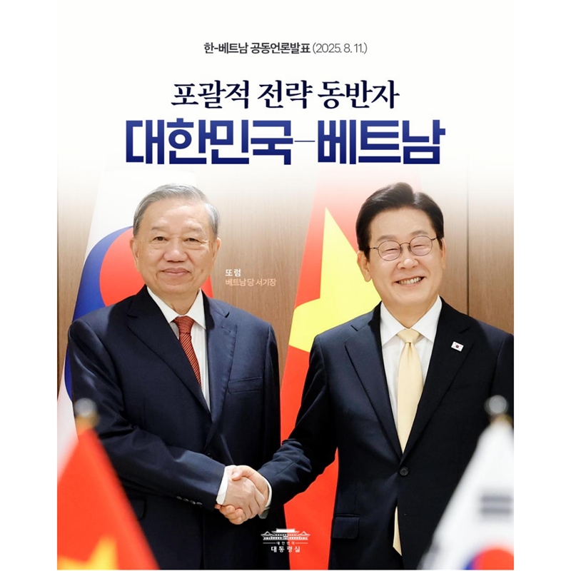 이재명 대통령 내외는 국빈방한 중인 또 럼 베트남 당서기장 내외와 8.12.(화) 오전 청와대 상춘재에서 친교 일정을 가졌습니다.